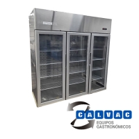 Refrigeradores industriales acero inoxidable, 3 puertas de vidrio. Construido en Acero inoxidable. Sistema de refrigeración por AIRE FORZADO. Control de Temperatura por termostato digital. Sistema de descongelamiento automático. Tres puertas de vidrio de cierre hermético. Parrillas de acero regulables. Base con ruedas y frenos.