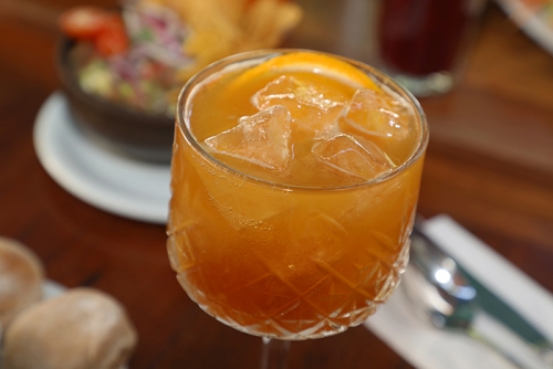 es servido con hielo, rodaja de limón y coronado con soda o agua con gas.