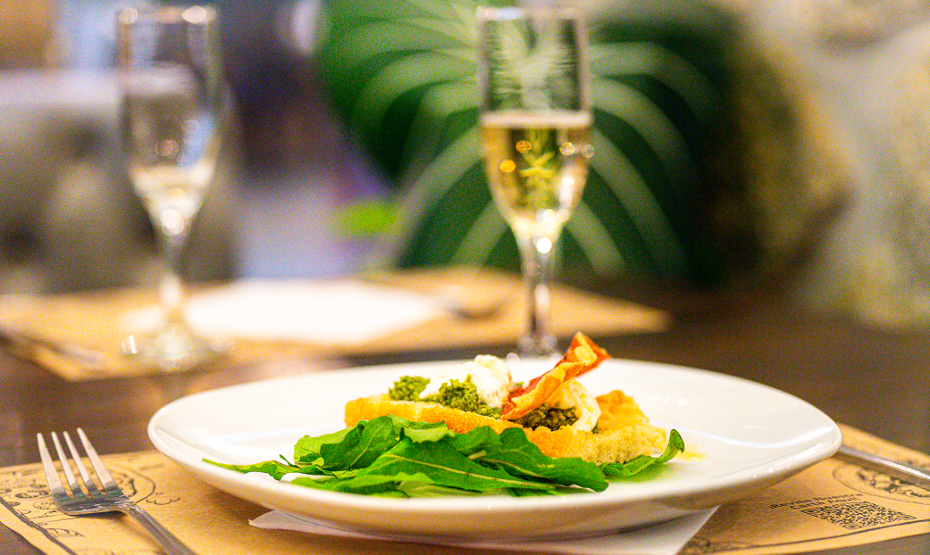 - Primer tiempo: bruschetta al pesto e stracciatella totalmente hecho en casa, maridaje Prosecco Extra Brut.