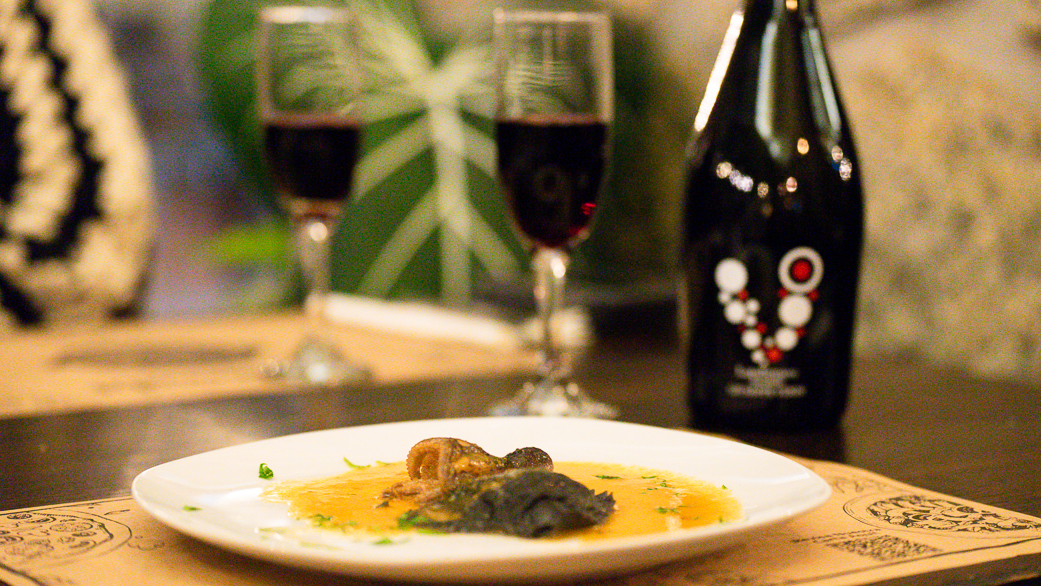 - Tercer tiempo: cuore nero, raviolo al salmone ahumado maridaje Lambrusco Ceci de la casa.
