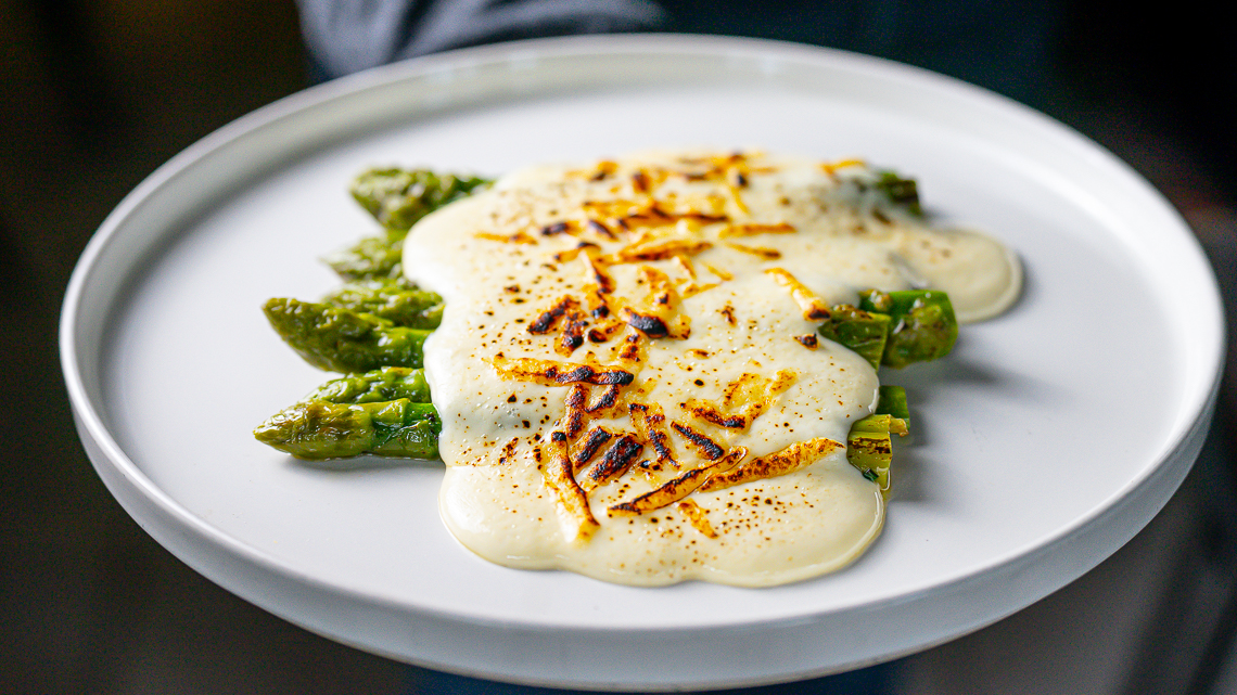 Espárragos a la parmesana. Una elaboración sencilla, pero que gracias a la mezcla de sus ingredientes se convierte en una bomba de sabor con un queso sedoso y un toque de cebolla pluma. Diría que podría convertirse en un imperdible.