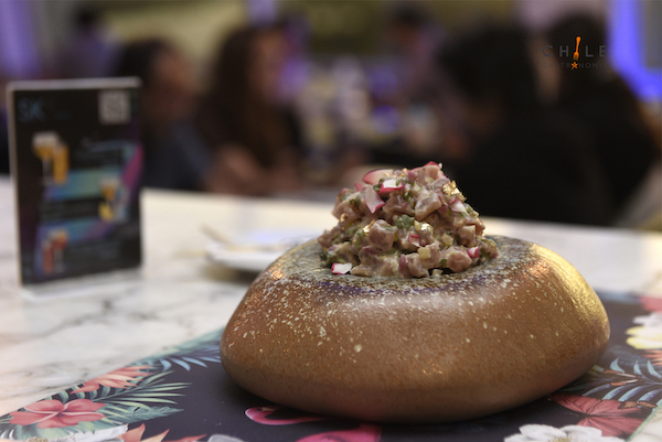 Atún en Piedra que posee atún marinado en crema de limón, cebolla y ají encurtido terminado con mostaza en grano y cilantro, acompañado de crocancias de la casa.